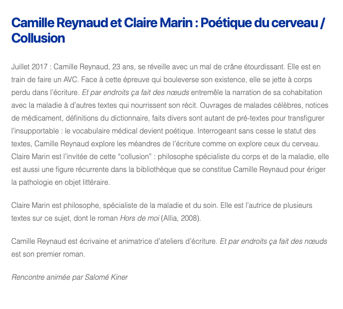 « Juillet 2017 : Camille Reynaud, 23 ans, se réveille avec un mal de crâne étourdissant. Elle est en train de faire un AVC. Face à cette épreuve qui bouleverse son existence, elle se jette à corps perdu dans l’écriture. Et par endroits ça fait des nœuds entremêle la narration de sa cohabitation avec la maladie à d’autres textes qui nourrissent son récit. Ouvrages de malades célèbres, notices de médicament, définitions du dictionnaire, faits divers sont autant de pré-textes pour transfigurer l’insupportable : le vocabulaire médical devient poétique. Interrogeant sans cesse le statut des textes, Camille Reynaud explore les méandres de l’écriture comme on explore ceux du cerveau.