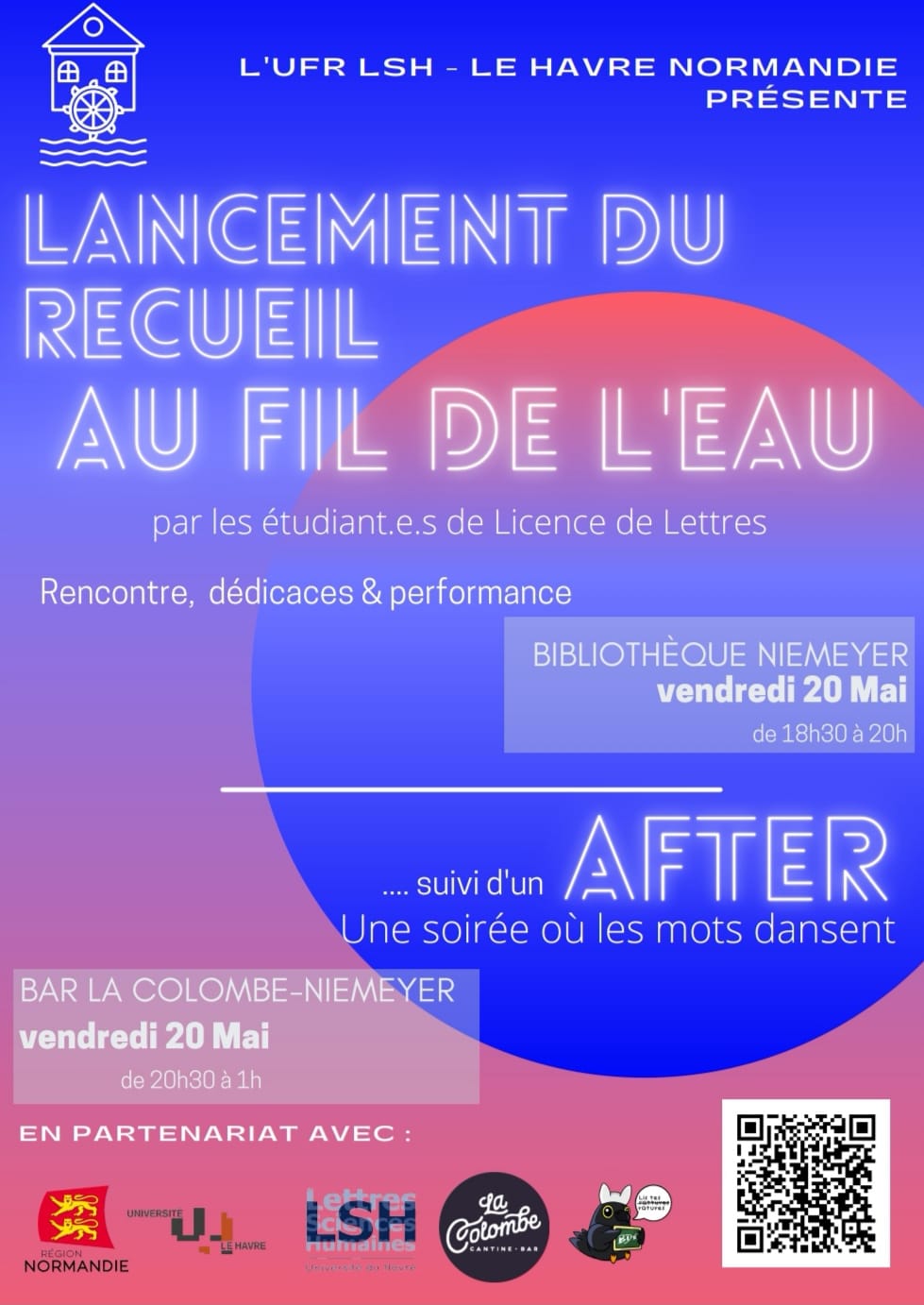 J’ai eu la joie d’animer en décembre 2021 un workshop de deux jours au moulin d’Andé auprès des étudiants de L3 Lettres Modernes de l’université du Havre. Le restitution de leur travail s’est effectuée en deux temps : en janvier sur la scène du Fitz au Volcan autour d’une lecture musicale, puis en mai à la bibliothèque Oscar Niemeyer pour la présentation de leurs textes publiés sous forme d’un recueil.