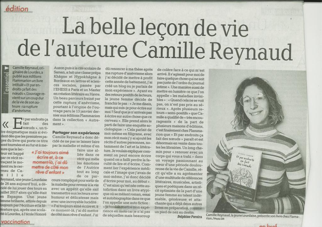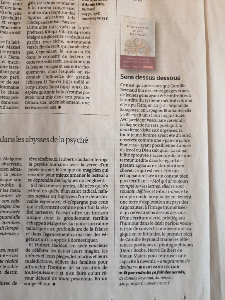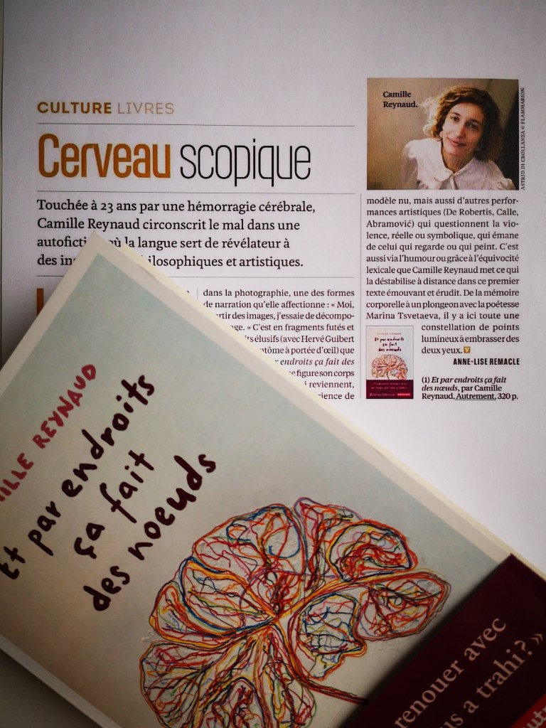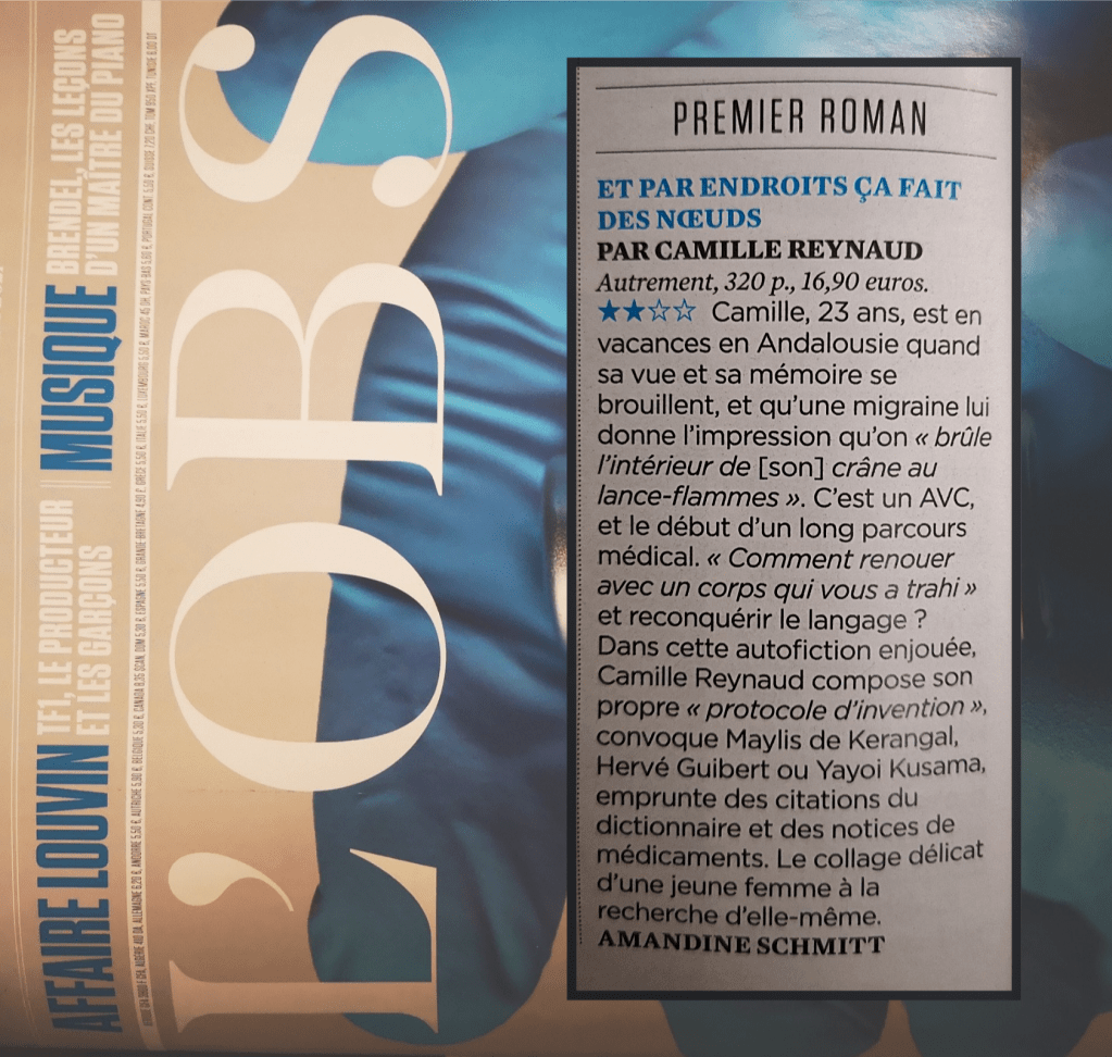 « C’est en fragments futés et autoportraits élusifs (avec Hervé Guibert et son Image fantôme à portée d’oeil) que se construit Et par endroits ça fait des noeuds […] C’est aussi via l’humour ou grâce à l’équivocité lexicale que Camille Reynaud met ce qui la déstabilise à distance dans ce premier texte émouvant et érudit. De la mémoire corporelle à un plongeon avec la poétesse Marina Tsvetaeva, il y a ici toute une constellation de points lumineux à embrasser des deux yeux. »