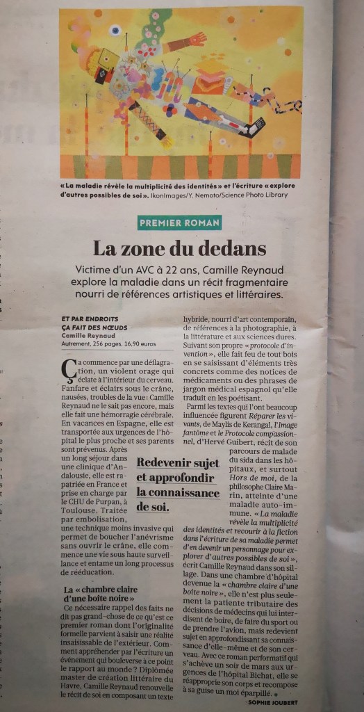 « Avec ce roman performatif qui s’achève un soir de mars aux urgences de l’hôpital Bichat, elle se réapproprie son corps et recompose à sa guise un moi éparpillé. »
